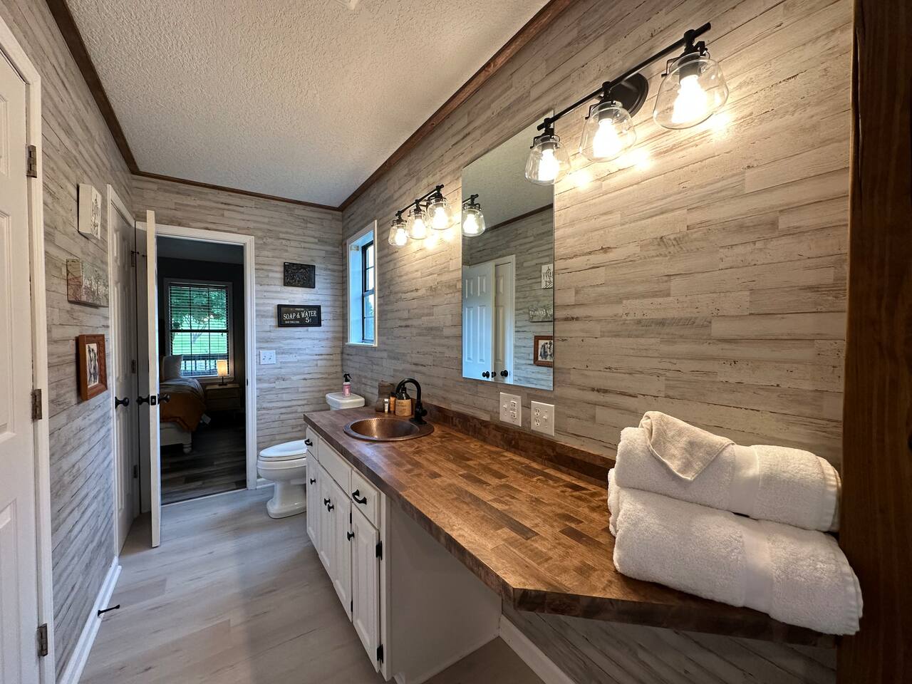 The cabin was very beautiful, clean, and right size for our family of 4…was more than a the walk we wanted to get to the river…but then again we thought smart and carried down what we needed all at once stayed few hours got kissed by the sun and enjoyed fishing. Home is absolutely precious! Beds were amazing too! We enjoyed our stay!